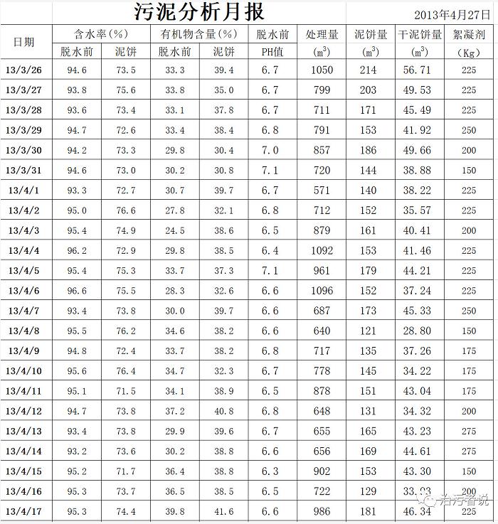 我們今天需要進(jìn)行討論的是關(guān)于污泥車(chē)間的運(yùn)行統(tǒng)計(jì),污泥車(chē)間作為污水廠(chǎng)污泥處置的主要生產(chǎn)車(chē)間,需要和污水車(chē)間配合進(jìn)行整體的生產(chǎn)運(yùn)行,污泥車(chē)間根據(jù)污泥脫水原理,需要在生產(chǎn)過(guò)程中添加高分子絮凝劑PAM,有些還要添加一些無(wú)機(jī)的化學(xué)調(diào)理劑,這是污泥車(chē)間的成本的主要支出項(xiàng)目;污泥車(chē)間每日的進(jìn)泥量,每日脫水后的泥餅量,是污泥車(chē)間的主要的生產(chǎn)指標(biāo);每日脫水前后含水率的變化,是污泥車(chē)間脫水的效能指標(biāo)。這些指標(biāo)綜合反映了污泥脫水生產(chǎn)的各個(gè)環(huán)節(jié),在污泥車(chē)間日常生產(chǎn)中需要對(duì)這些指標(biāo)內(nèi)容進(jìn)行詳細(xì)的生產(chǎn)統(tǒng)計(jì)。